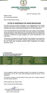 In an official letter dated December 30, 2025, and signed by the President of the UPU Youth Wing Worldwide, Blessed Oghenero Ughere, the leadership said the suspension takes immediate effect following what it described as repeated violations of the union’s principles, values, and code of conduct.